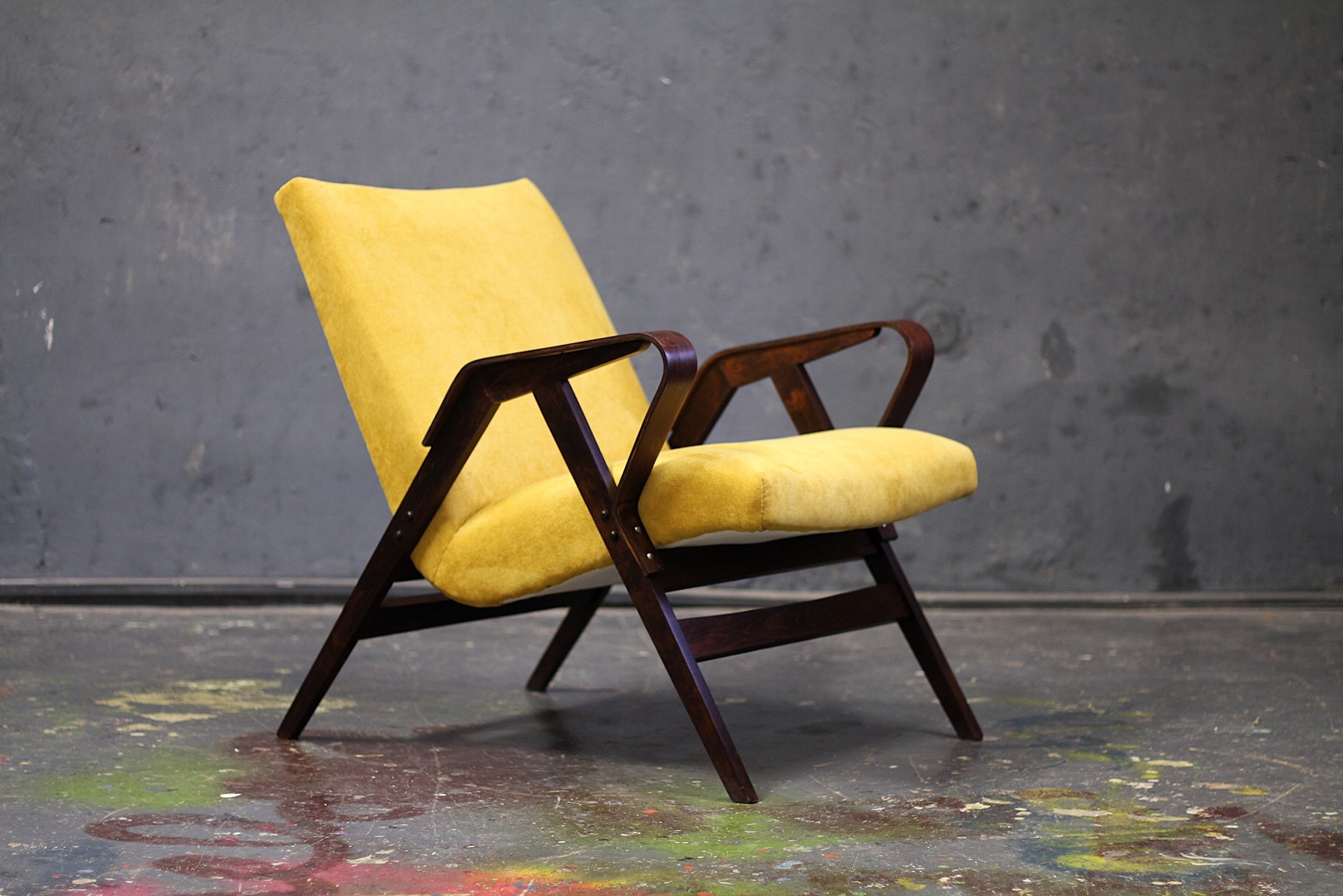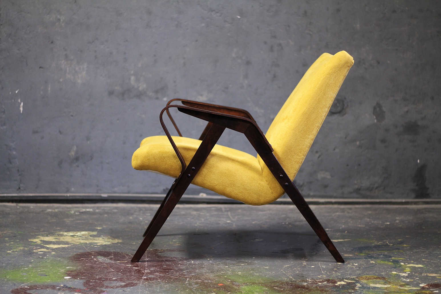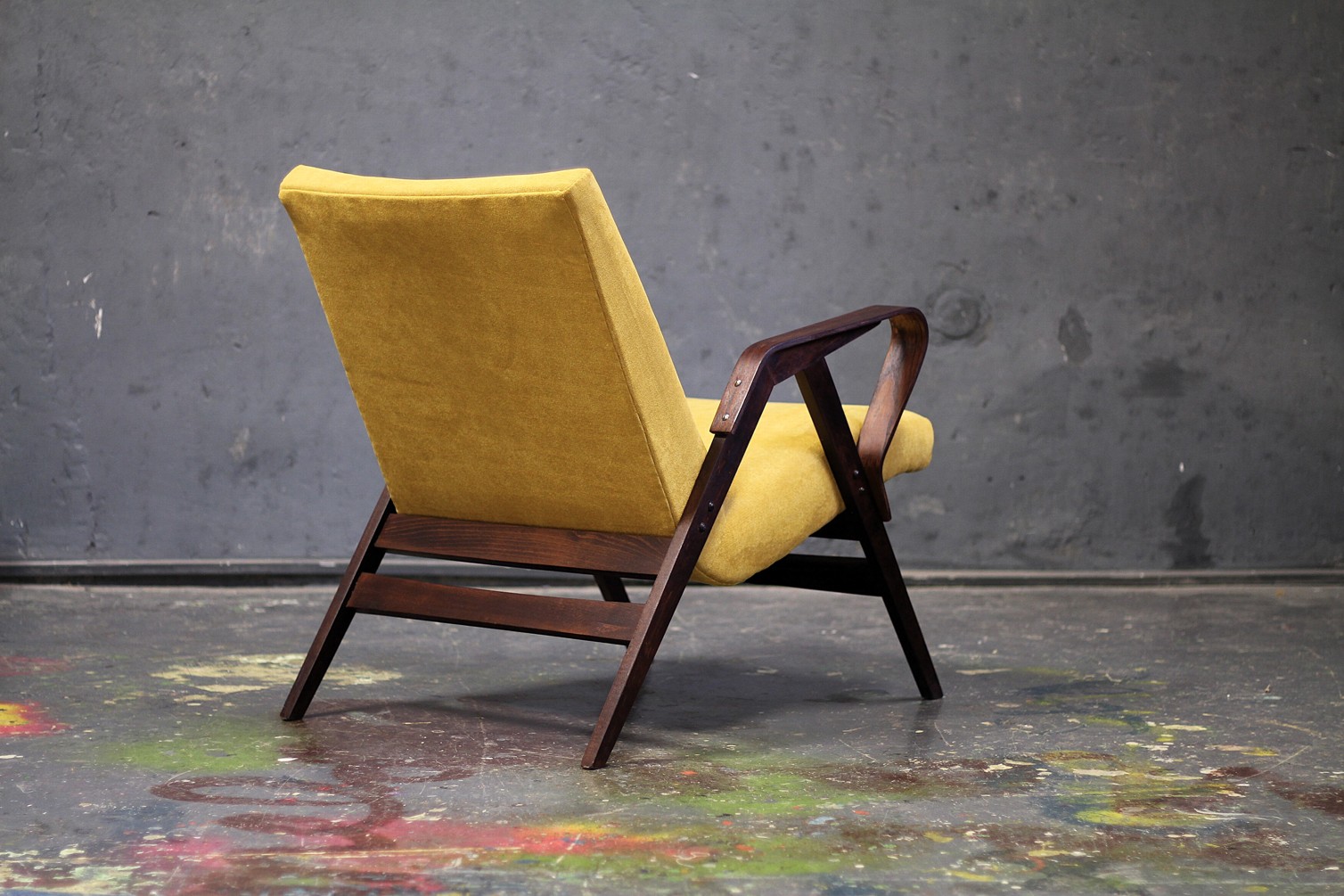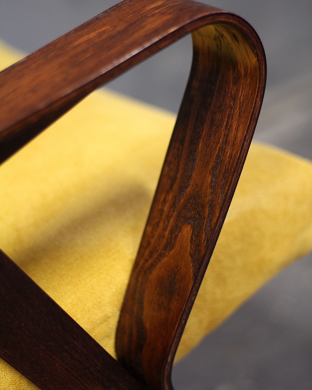 Dvojice neotřelých křesel Františka Jiráka pochází ze 70. let z národního podniku Tatra nábytok. Dřevěné části jsou namořeny speciálně namíchaným odstínem hnědé a ošetřeny tvrdým voskovým olejem. Křesla jsou potažena látkou Dublin 25 od české firmy Compo. Výrazná kombinace žluté a hnědé rozzáří každý interiér.